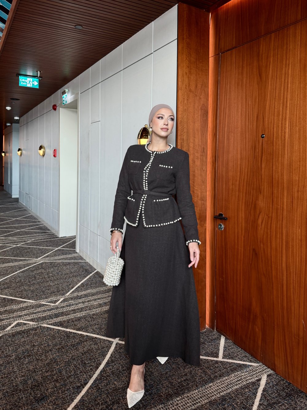 هذه البدلة مصنوعة من قماش شانيل عالي الجودة. يتميز الجاكيت بتفاصيل اللؤلؤ، جيوب، بطانة، وسائد كتف، وحزام. التنورة مزودة بإغلاق بسحاب. أبعاد الجاكيت: الطول 60 سم، الكتف 36 سم، الصدر 38 سم. أبعاد التنورة: الطول 93 سم، الخصر 37 سم.