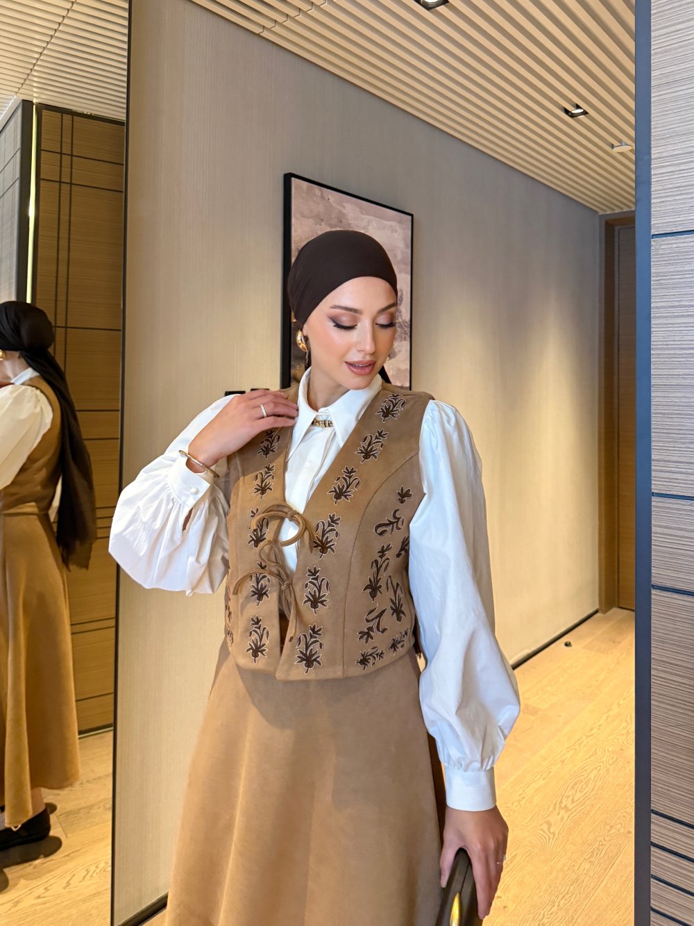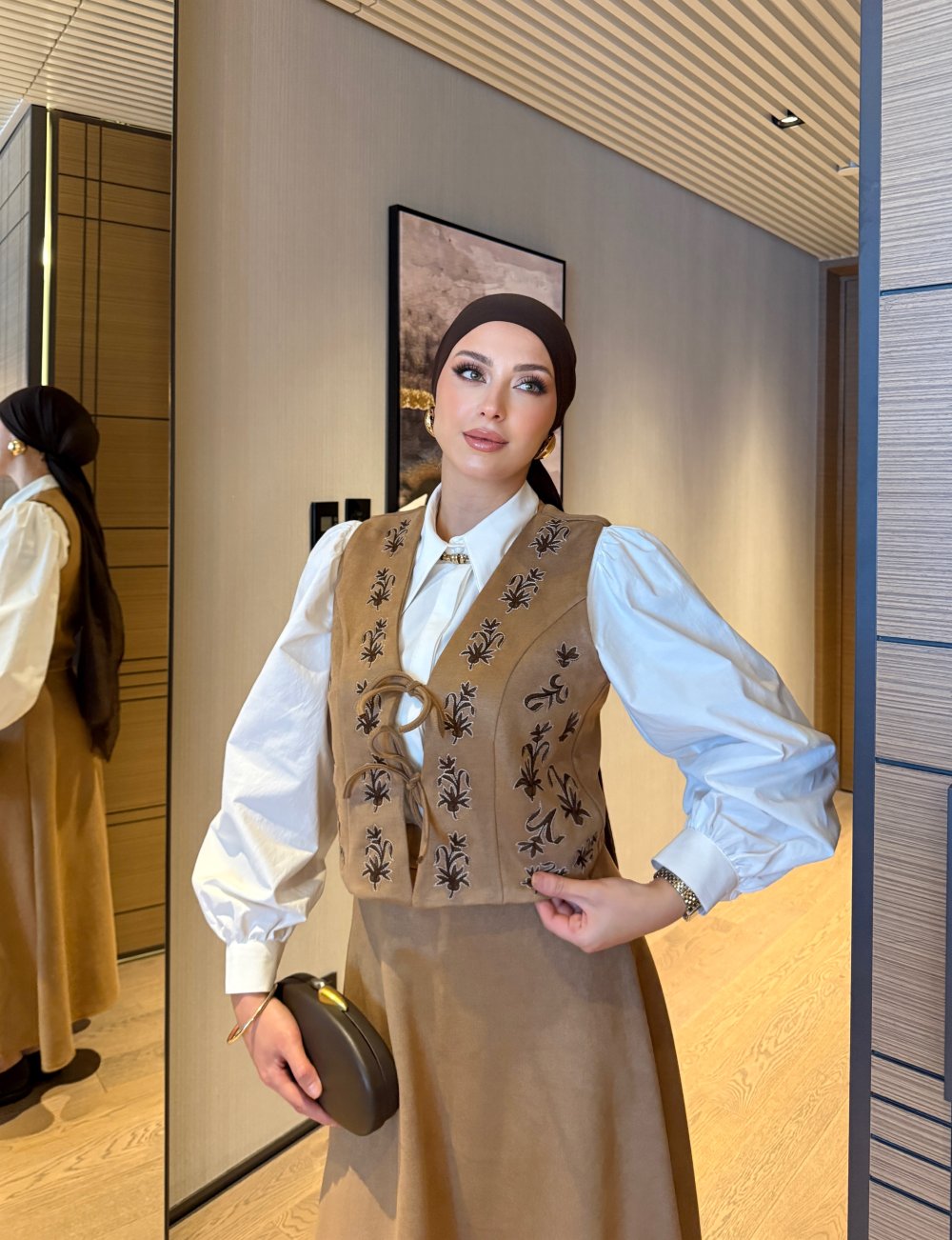 هذه البدلة مصنوعة من الجلد المدبوغ عالي الجودة. يتميز السترة بتطريز مفصل وإغلاق برباط أمامي. الجيبة مزودة بسحاب خلفي لملاءمة مثالية. طول السترة: 47 سم، الكتف: 34 سم، الصدر: 48 سم. طول الجيبة: 93 سم، الخصر: 36 سم.