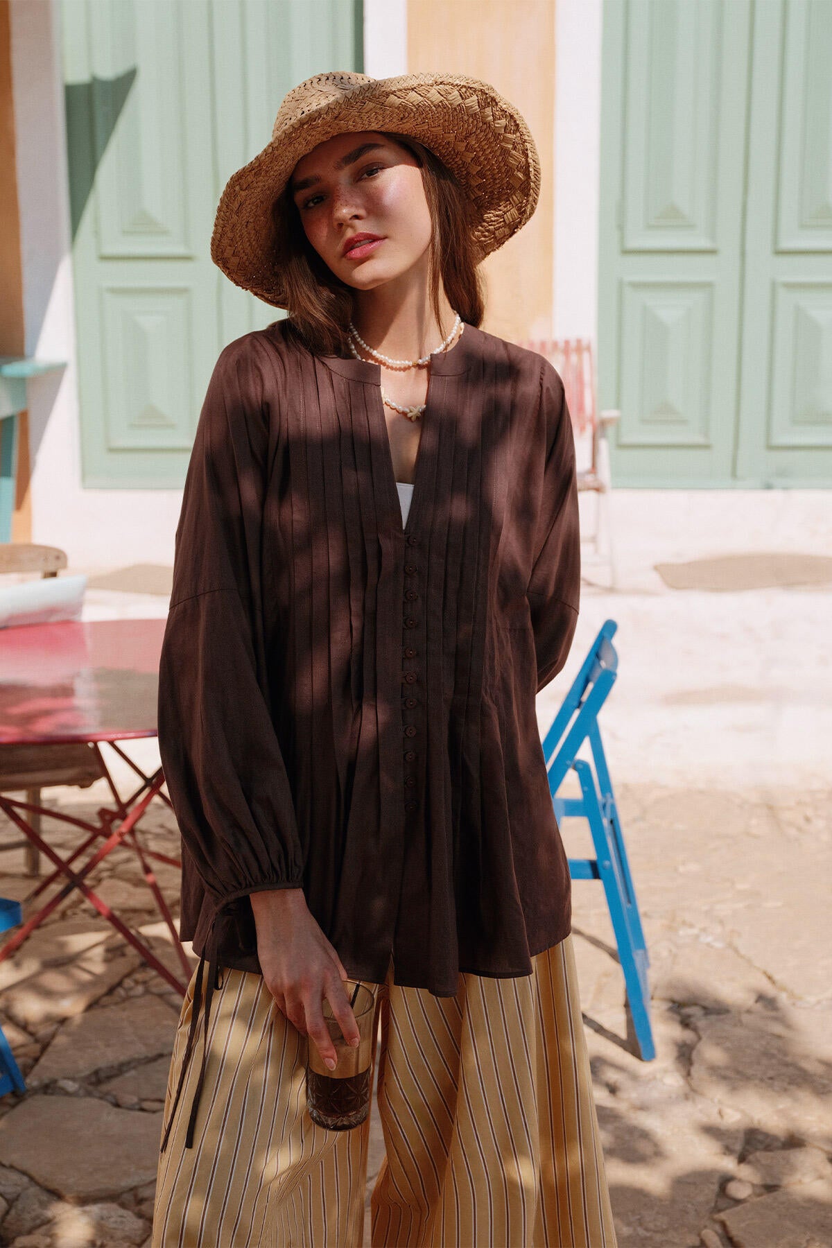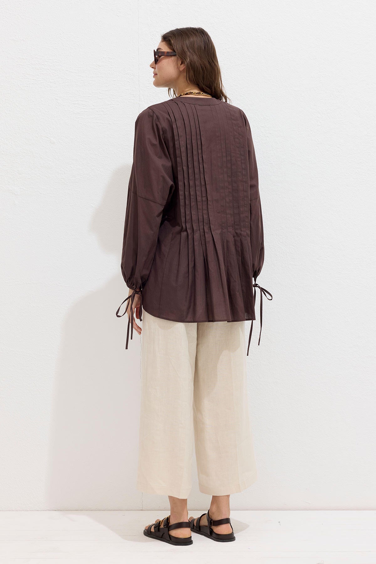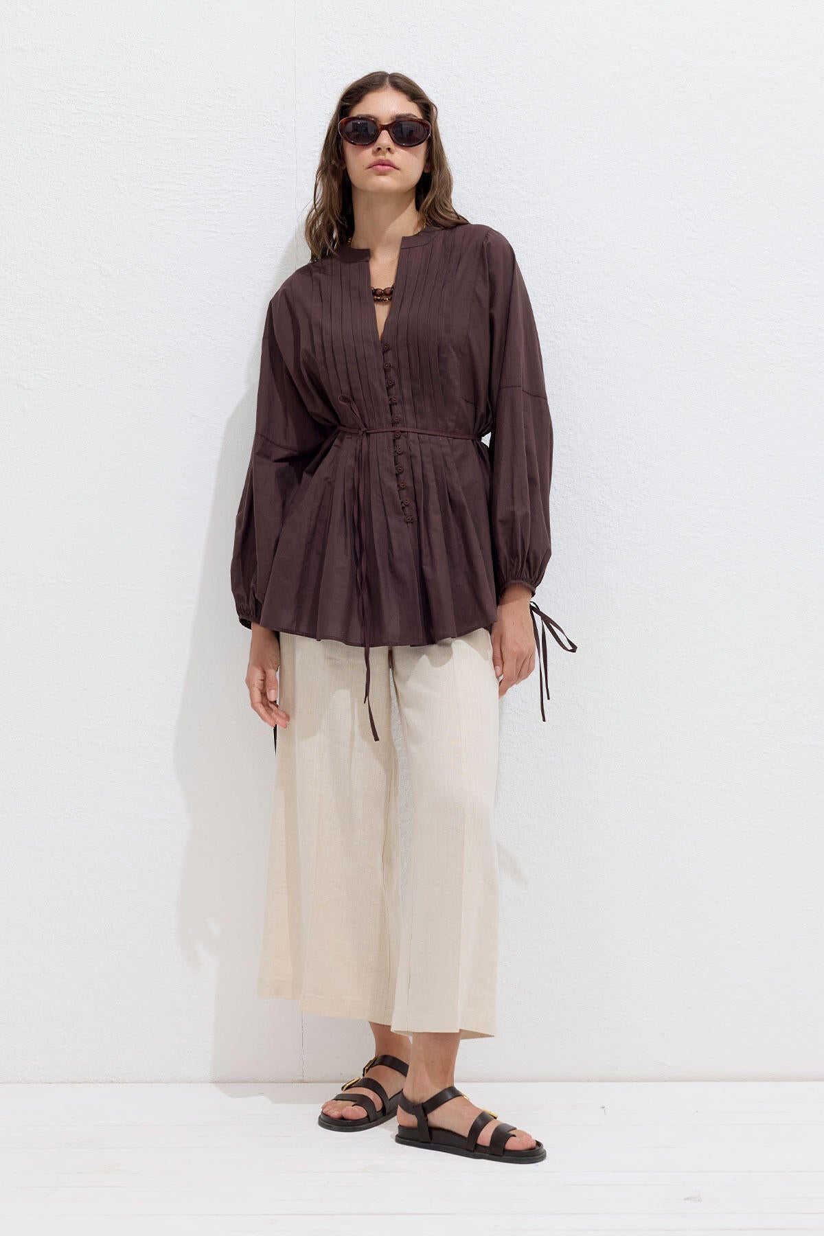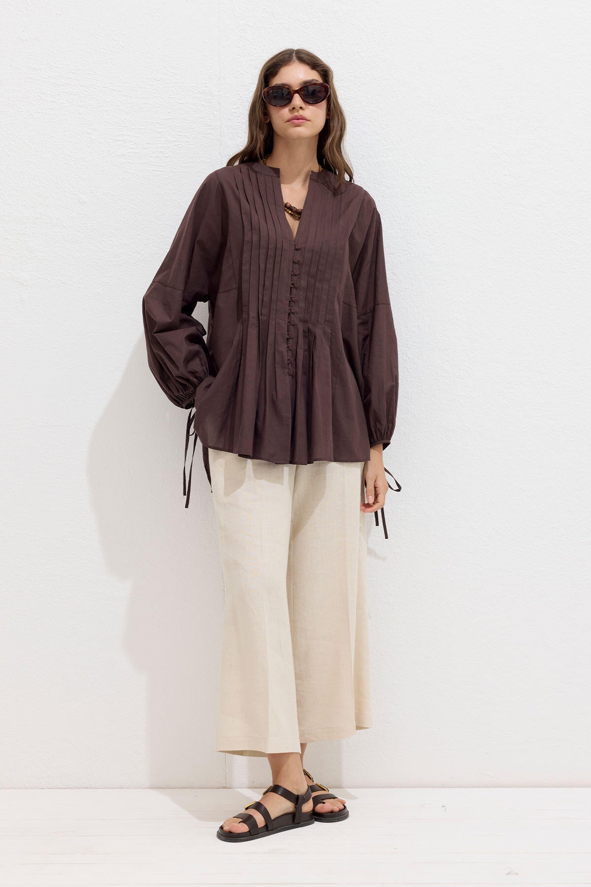 ياقة دائرية مع خياطة مكسرة، أكمام طويلة منفوخة مع أساور مربوطة، مصنوع من نسيج فوال القطن.