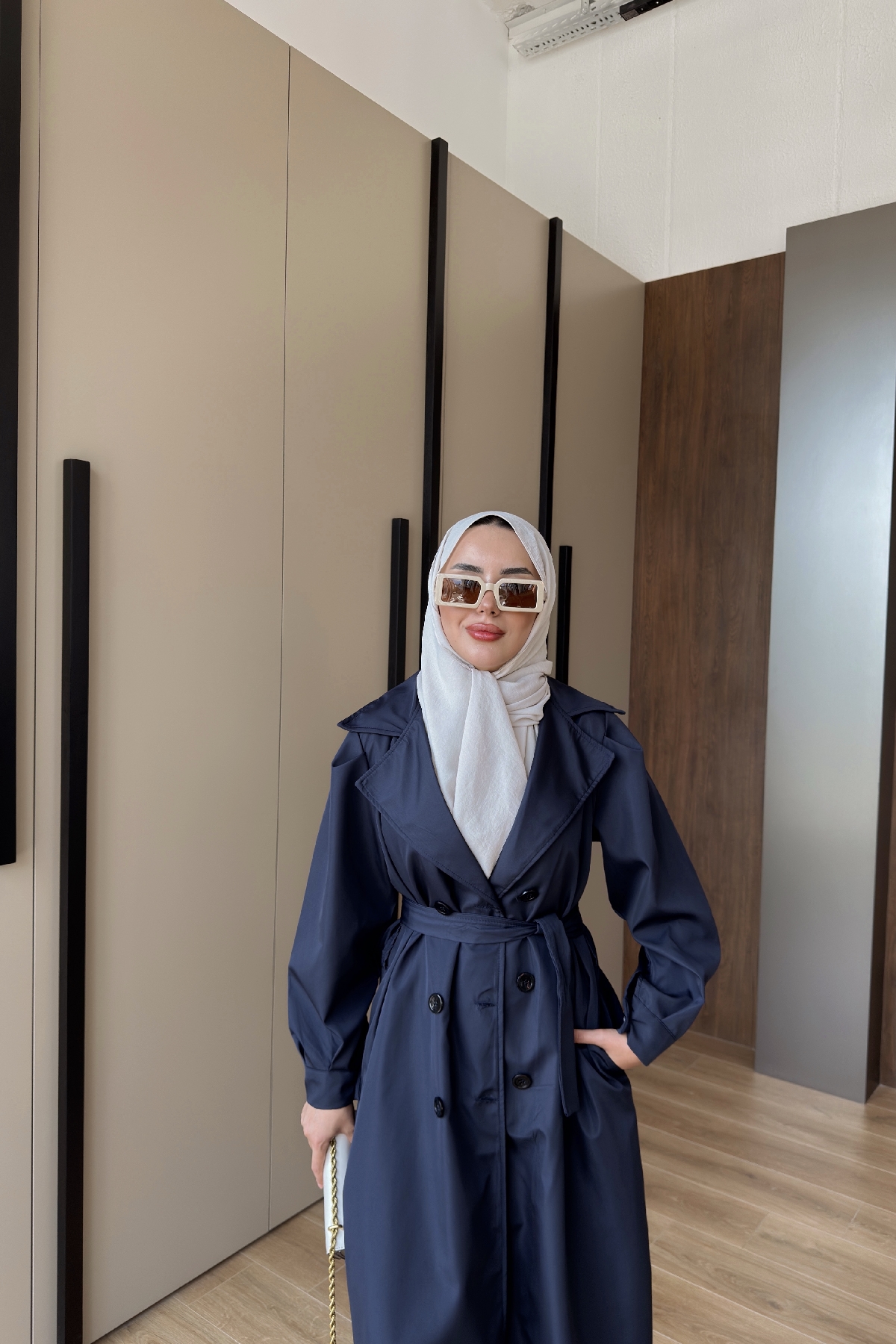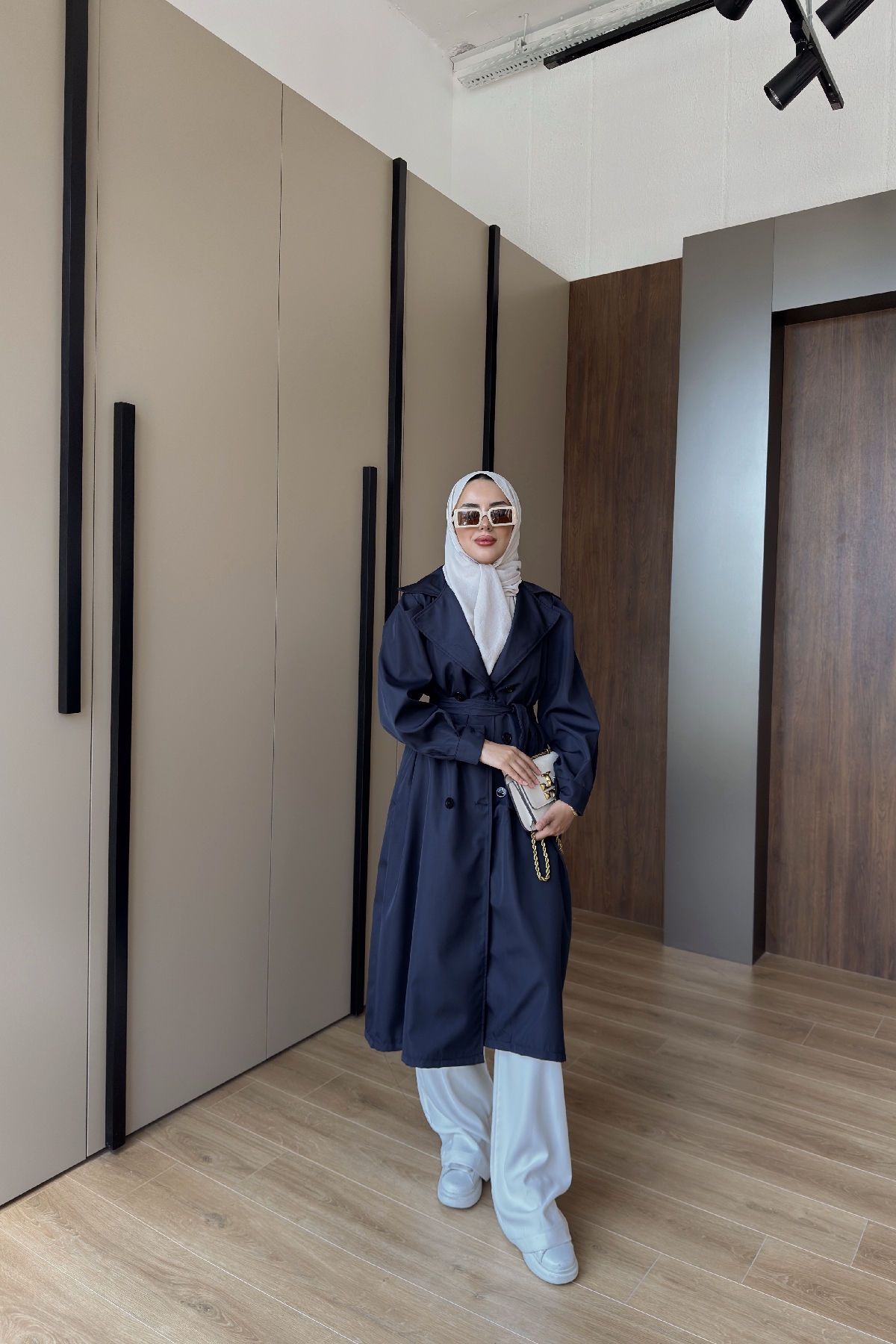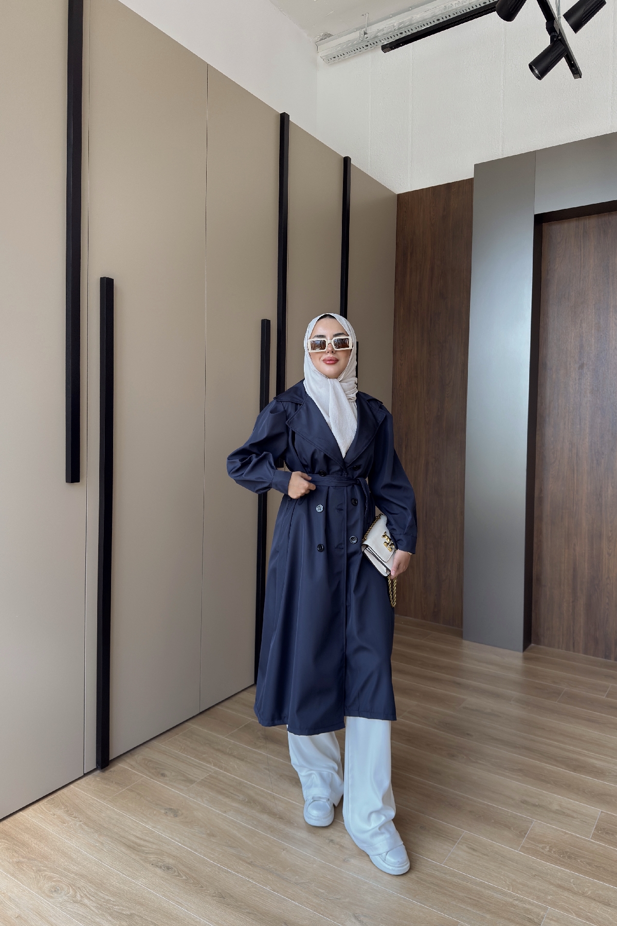 لا يمكن إرجاع هذا المنتج. مقاسات العارضة: الطول – 165 سم / الوزن – 55 كغ. يأتي مع حزام متحرك. يُغلق من الأمام بأزرار. بدون بطانة. يحتوي على جيبين. النسيج: 90% بوليستر، 10% ليكرا. طول المنتج: 114 سم.