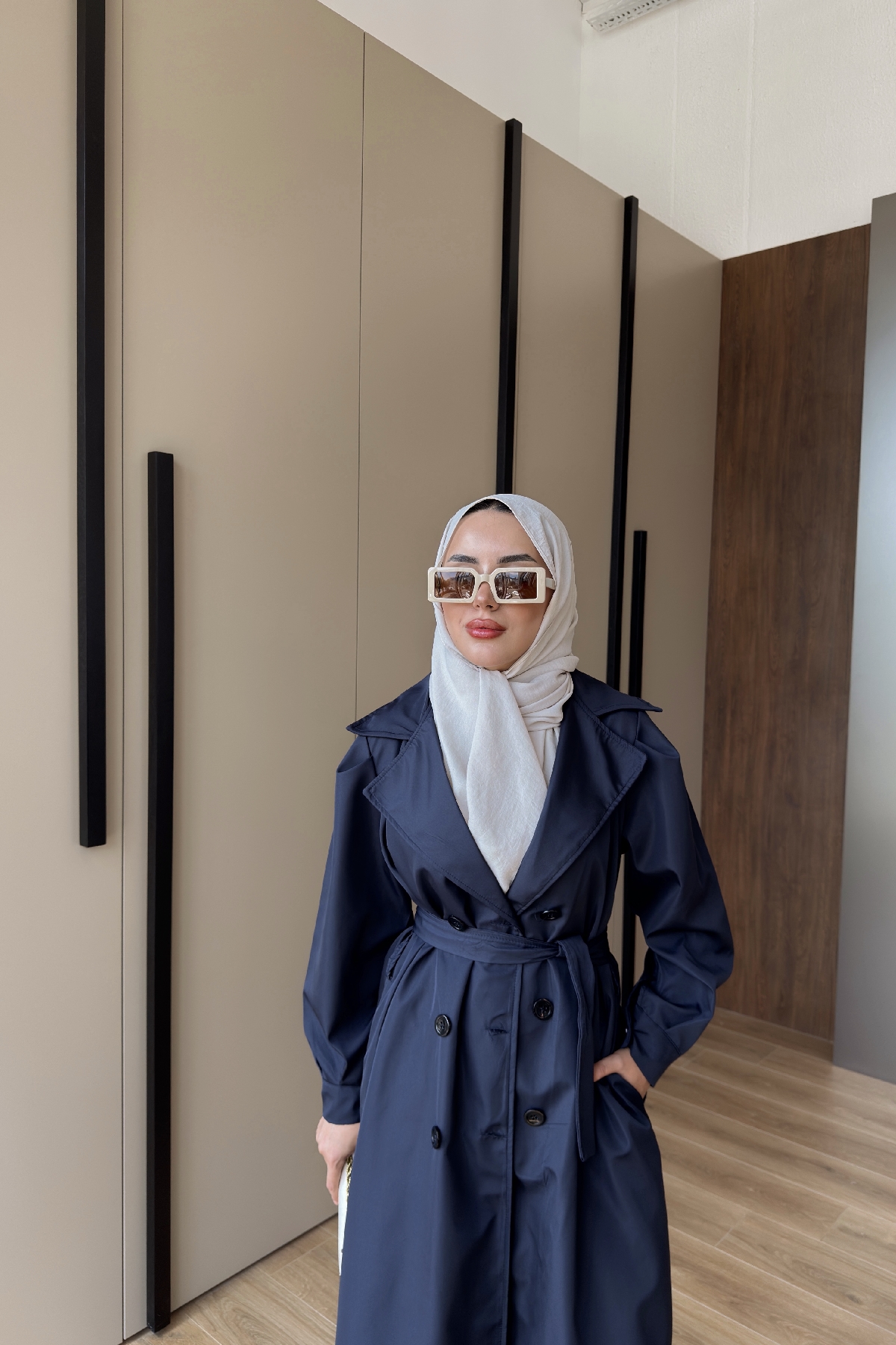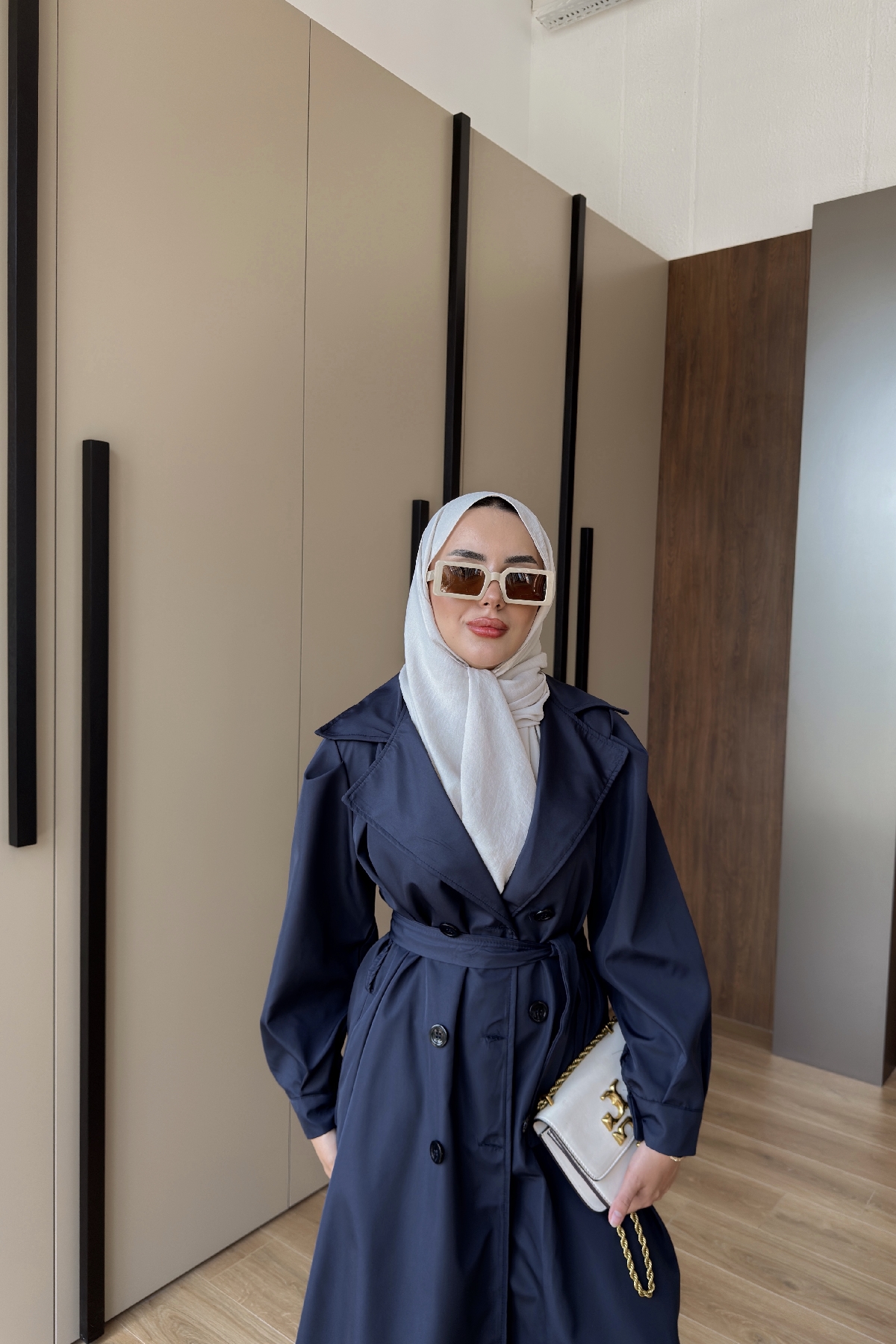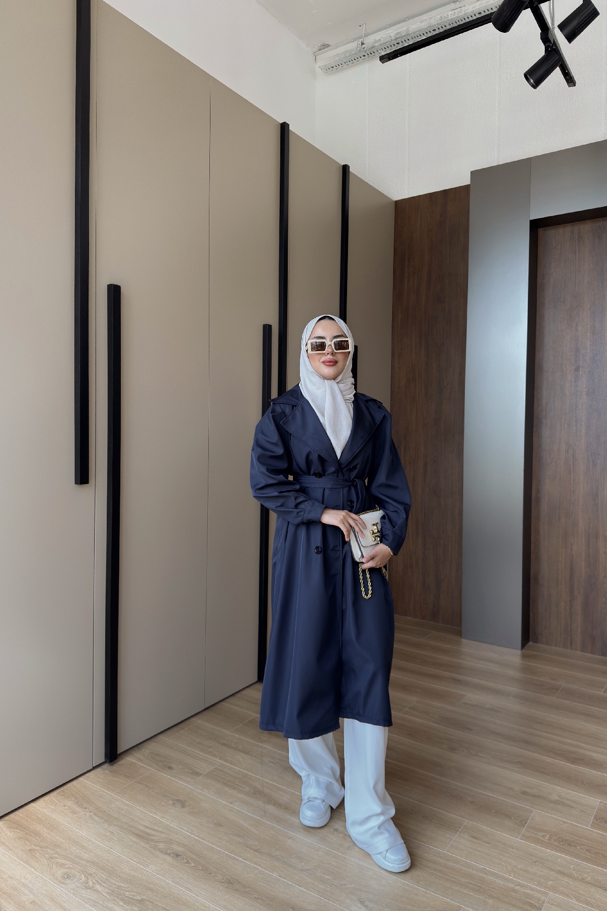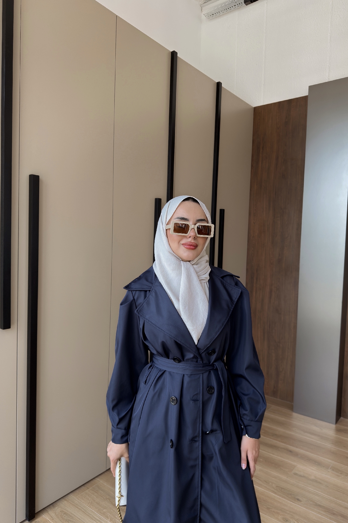 لا يمكن إرجاع هذا المنتج. مقاسات العارضة: الطول – 165 سم / الوزن – 55 كغ. يأتي مع حزام متحرك. يُغلق من الأمام بأزرار. بدون بطانة. يحتوي على جيبين. النسيج: 90% بوليستر، 10% ليكرا. طول المنتج: 114 سم.