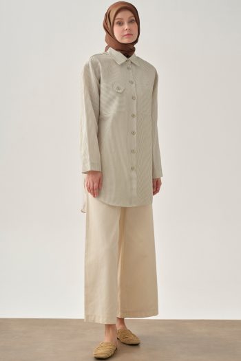 Ecru-Hidden Placket Long Shirt Tunic ₺2.535,83
