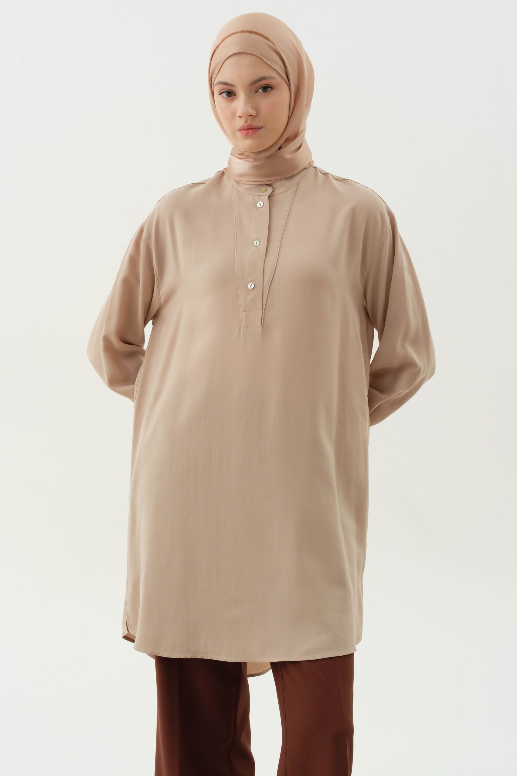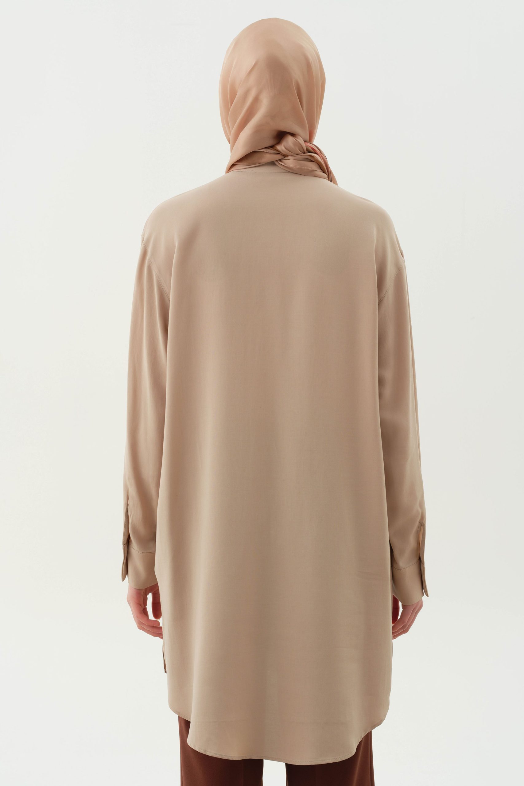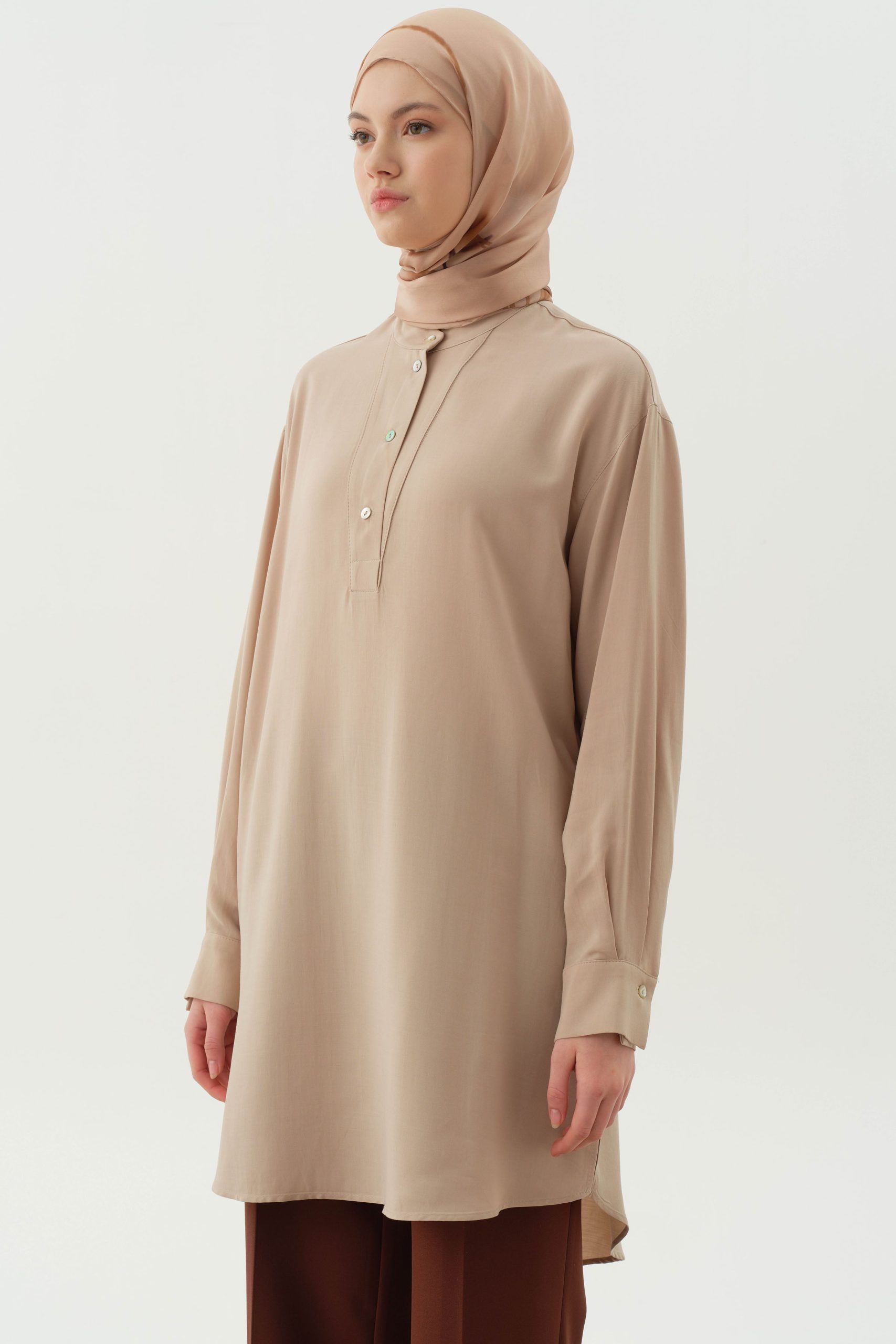 This tunic, with its half placket detail and asymmetric cut, showcases a modern stance with its simple elegance. Its light and fluid structure offers comfort throughout the day. It is an ideal complement for urban and dynamic styles.