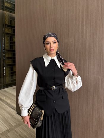 Complete your elegance with this vest featuring a blazer collar design and slit details. It offers a sophisticated and modern look with its high-quality fabric and comfortable fit. Perfect for both formal and stylish outfits.